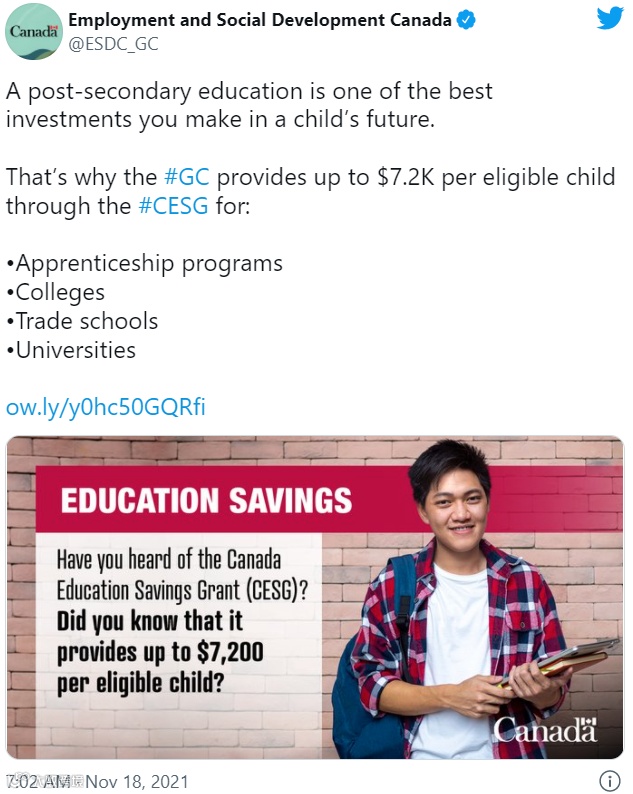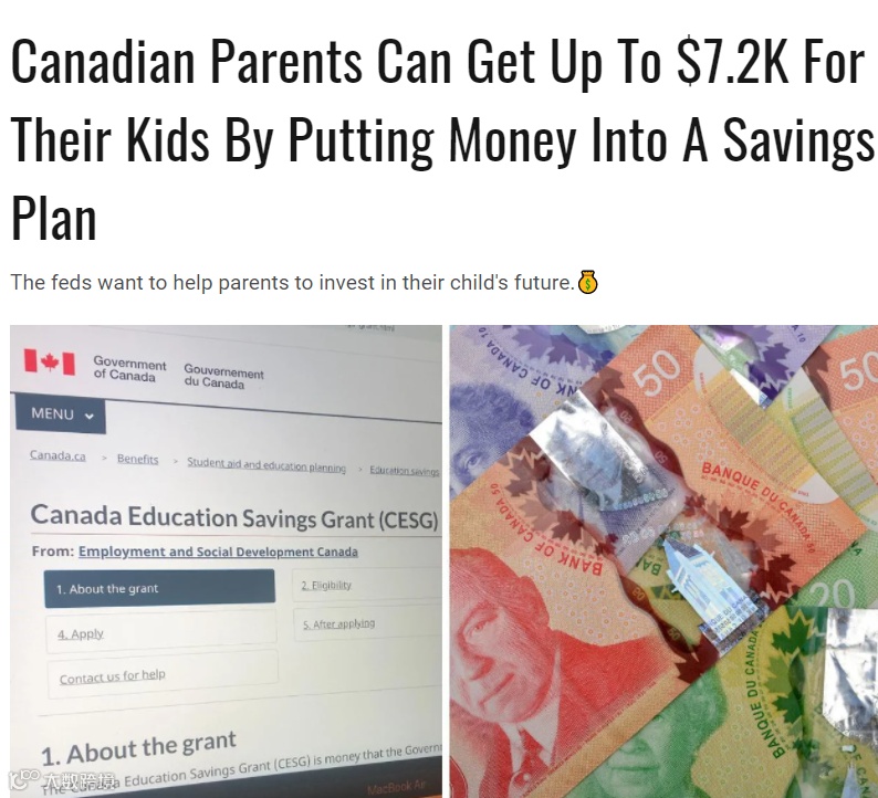 申请起来很简单,父母需要先给孩子开一个注册教育储蓄计划 (RESP),当家长每年往这个RESP里供款最高2500元时,政府就能提供该供款的20%的补贴,个人终生可获得最高补助金$7200。