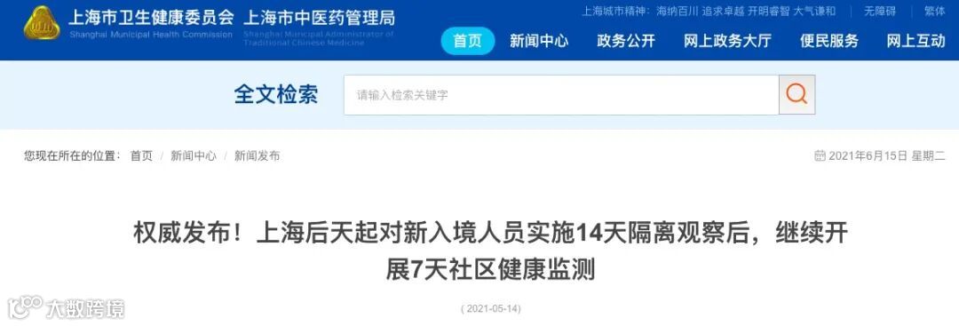自5月16日零时起,本市对新入境人员实施14天隔离观察后,继续开展7天社区健康监测,在隔离观察和社区健康监测期间实行6次核酸检测;对经研判为重点关注对象的,适当增加核酸检测频次。