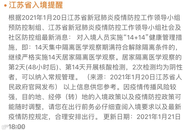 入境南京:14 天集中隔离+14 天居家隔离,期间进行两次核酸检测。