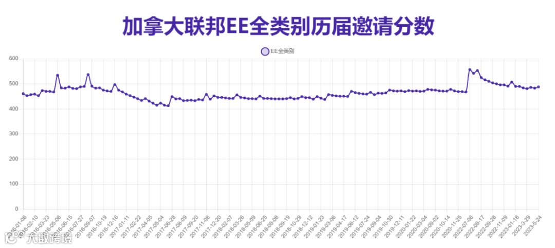 在2022年7月至8月期间,EE申请的录取分数线竟然一度暴涨到了557分,相当于适龄的申请人不光要有2年以上的本地工作经验,G类雅思分数还要考到8777以上。尽管最近一次发生在5月24日的EE抽签,分数线已经回落到了488分,但从近年来的分数趋势来看,要想回到曾经430分、本科学生毕业1年就能移民的程度,几乎是天方夜谭。