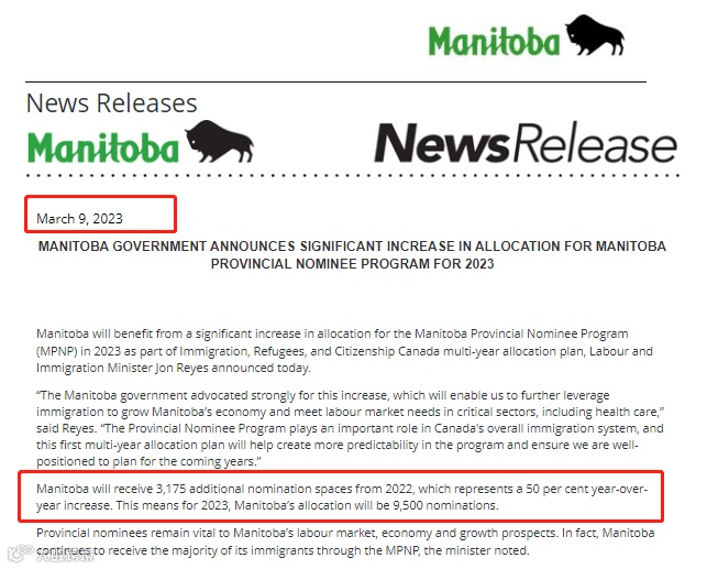 3月9日,曼省宣布2023年的省提名配额增加到9,500个,比2022年增长了3,175个,增加了近50%。