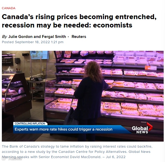 经济学家告诉路透社,推动加拿大通胀的潜在压力可能在今年第四季达到顶峰,不过多数人认为物价快速上涨的迹象正变得根深蒂固,并警告称,并警告说可能需要一次经济衰退来避免恶性循环。