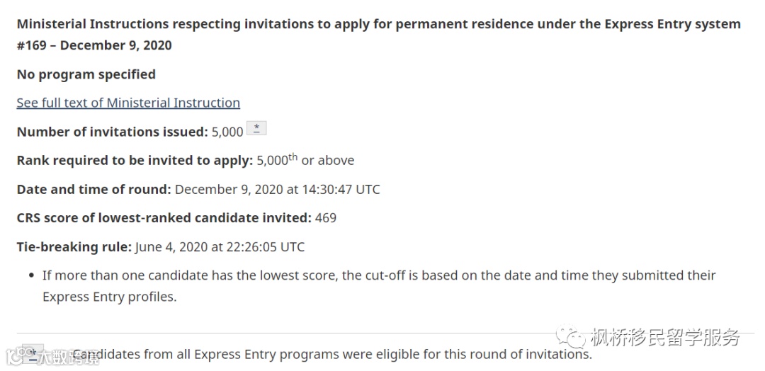 本次抽选是第169次,仍然是针对“特快通道”的全项目抽选。总计发放了5000份移民邀请函。最低分为469分。