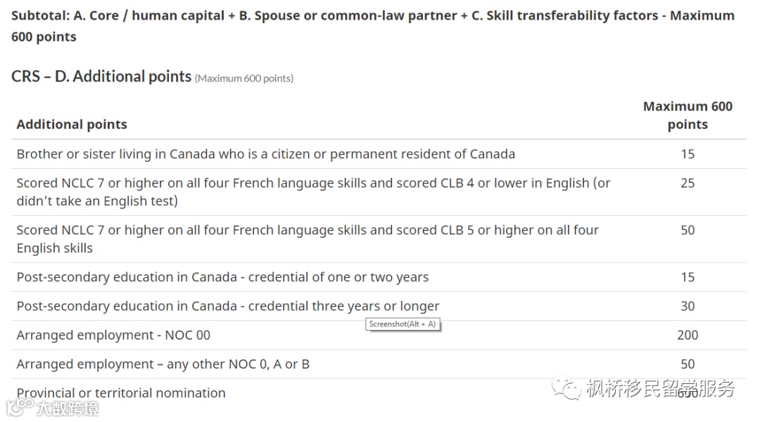 如果第一语言是法语,听说读写都在NCLC7以上,而且第二语言是英文CLB4或者以下的(就是没有英文考试的申请人),可以获得25分的加分;