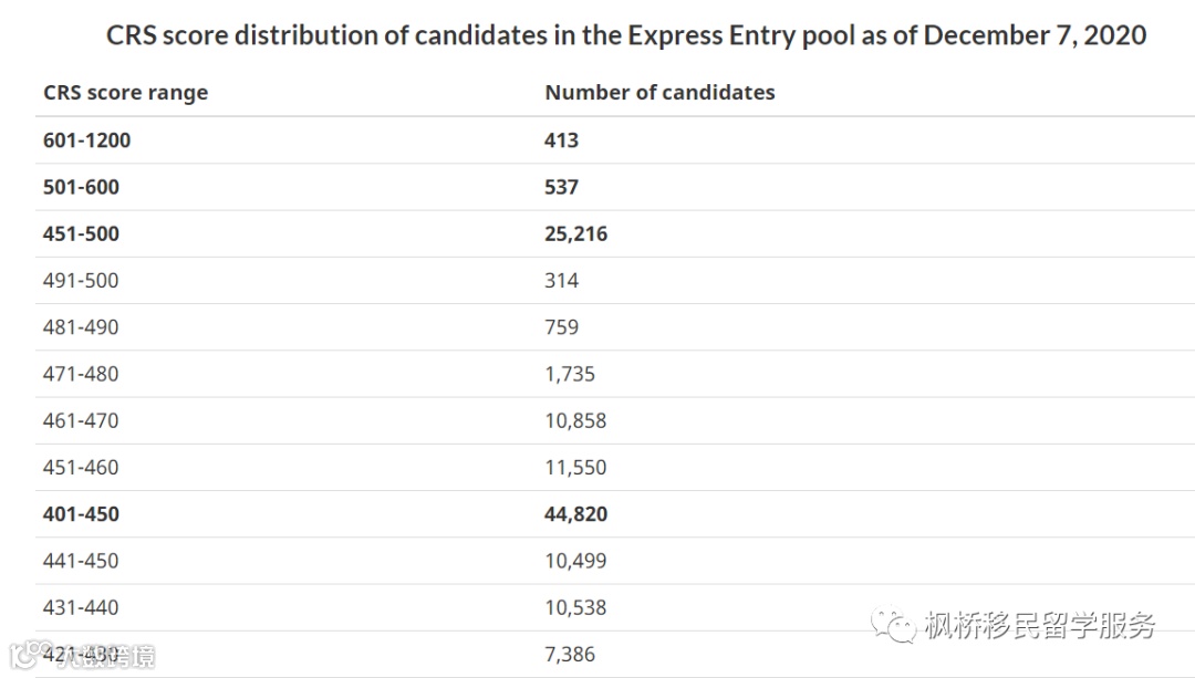 根据2020年12月7号CRS系统内的数据统计分析,在申请池中的申请人大多数集中在400-460之间的分数段。
