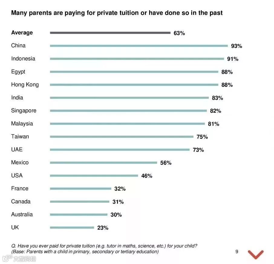 中国大陆地区的家庭平均每年教育支出高达42892美元,折合人民币近三十万元,而花钱给孩子支付私教(即各种补习班、特长班以及一对一补习等)的比例,高达93%,稳居全球第一。