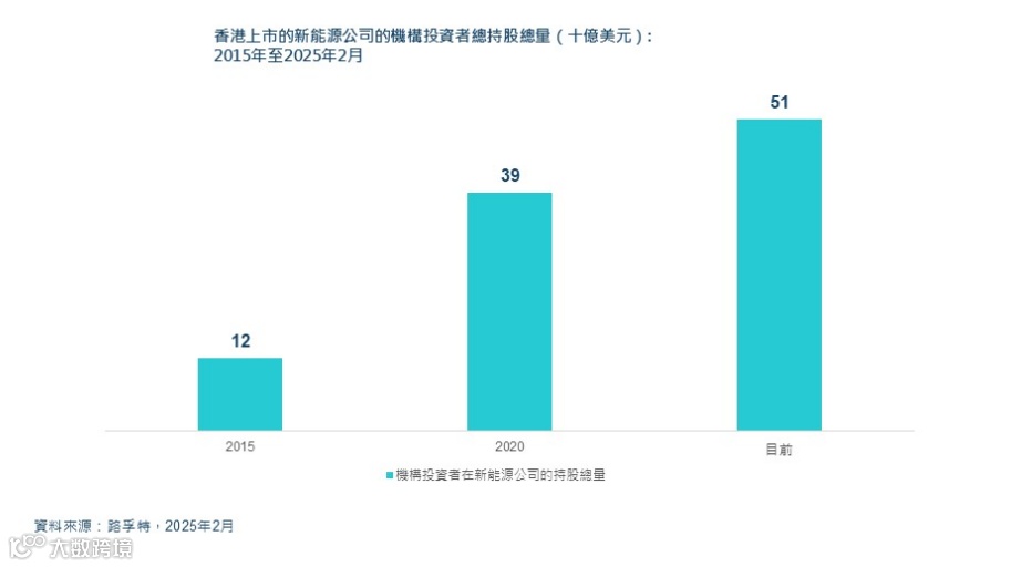 据路孚特统计,机构投资者对在港上市新能源企业的持仓规模由2015年底的120亿美元激增超过四倍至2025年2月的510亿美元。其中亚洲机构表现尤为活跃,持股由2015年的40亿美元增至2025年2月的约180亿美元。截至2025年2月,中国资金占机构投资总额的约15%。