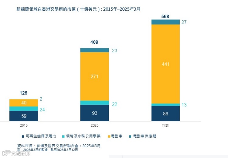 据统计,香港股票市场新能源板块市值规模自2015年至 2025 年 3 月已增长超过四倍,从 1,250 亿美元增至 5,680 亿美元,占香港市场总市值比重达 12.5%。