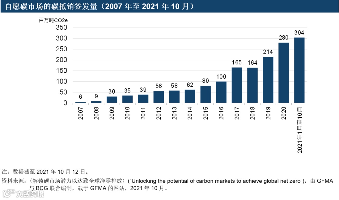 自愿碳市场近年亦发展迅速,全球碳抵销的全年签发量在2021年首十个月达至3.04亿吨CO2e,交易金额于2021年也达到20亿美元。