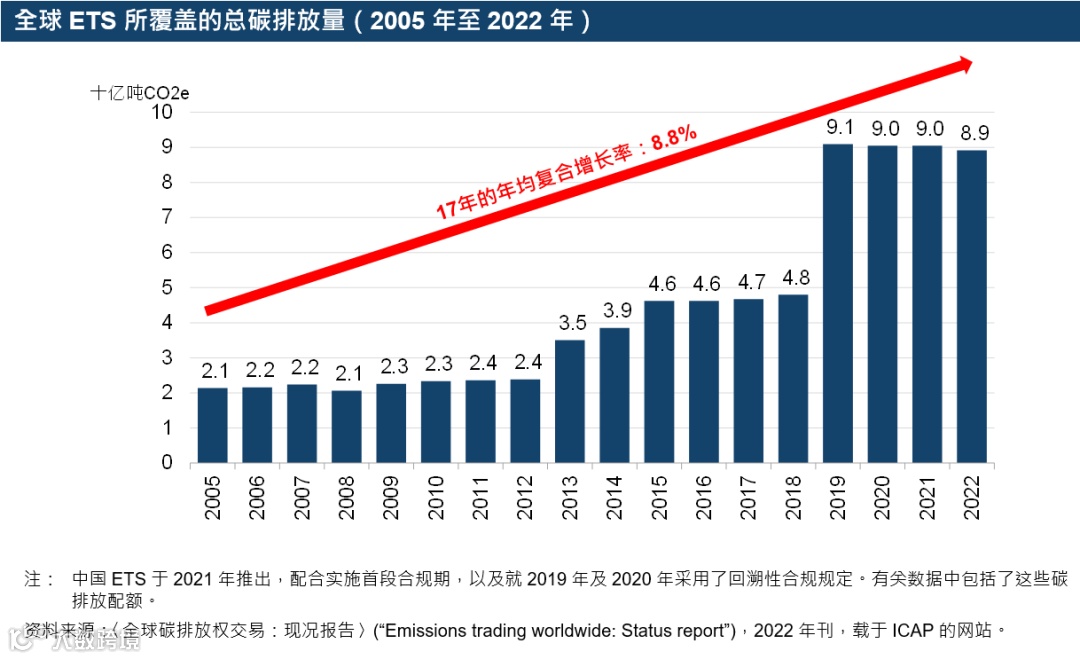 强制碳市场在2022年覆盖约89亿吨二氧化碳当量(CO2e)全球总碳排放量,而全球主要ETS的总成交量于2021年达157.73亿吨CO2e。