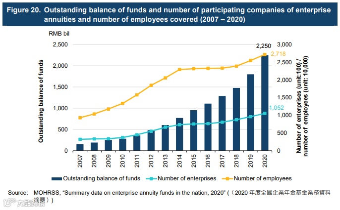 At the end of 2020, a total of about 105,200 enterprises have established enterprise annuities, with 27.17 million participating employees and achieving an outstanding fund balance of RMB2.25 trillion.