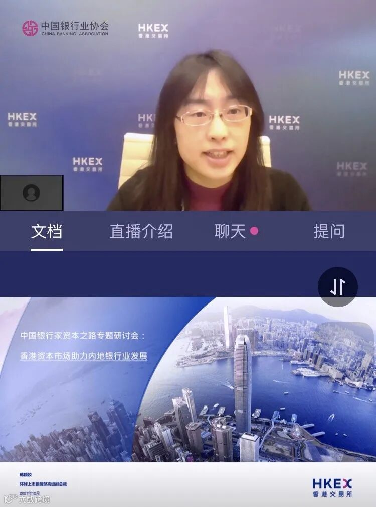 随后,香港交易所环球上市服务部高级副总裁韩颖姣向与会者介绍香港新股市场的最新动态及上市规则的最新指引,并表示香港交易所欢迎更多内地银行赴港上市,借力香港国际资本市场进一步发展。截至十月三十一日,在港上市的银行共有40家,首发募资总额约7,600亿港元,并完成再融资约7,900亿港元,中资银行占33家。