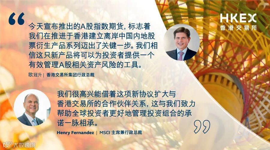 香港交易所集团行政总裁欧冠升表示:"今天宣布推出的A股指数期货,标志着我们在推进于香港建立离岸中国内地股票衍生产品系列迈出了关键一步。我们与MSCI的长期合作关系亦更为紧密,共同努力发展香港成为亚洲顶尖衍生产品交易中心,提升香港市场投资产品的深度及广度。作为亚洲时区的领先市场,我们肩负连接中国与世界的重任,这只新产品将可以为投资者提供一个有效管理A股相关资产风险的工具。"