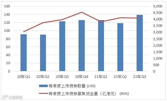 香港上市债券市场持续活跃,挂牌数目及集资额均显着增长。今年前三季度共迎来383只债券在港上市,总募集金额逾1.2万亿港元,较去年同期分别增加26%和12%。截止九月底,香港交易所上市存续债券数量达1,735只,市场规模近6.3万亿港元。