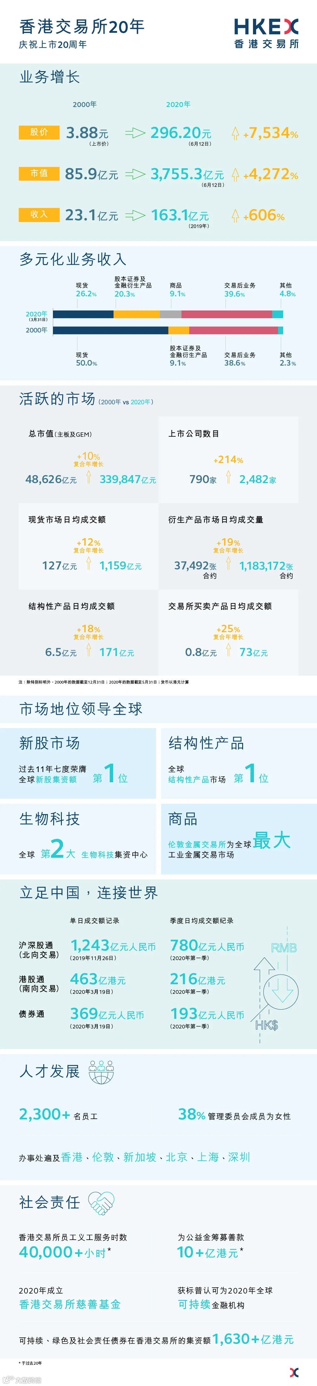 转眼今年已是香港交易所在香港上市二十周年。我们衷心感谢客户、投资者、合作伙伴及员工一直的支持,推动香港交易所稳步发展成为国际领先的亚洲时区交易所,连接中国与世界。精彩的过去成就了今天的香港交易所。我们会继续努力,迎来下一个更精彩的二十年。