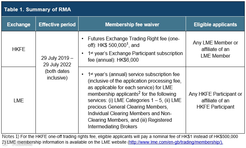 A Reciprocal Membership Arrangement has been introduced in order to encourage LME members to join the HKFE, and vice versa. The exchanges will waive their membership fees for members or affiliates of the reciprocal exchanges.