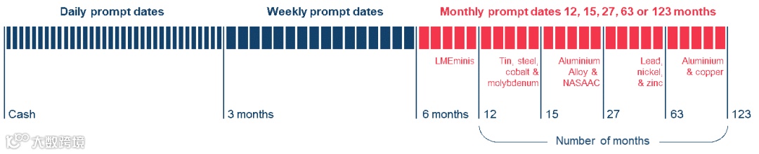 The time between a physical contract being agreed and the time it is settled can span years, leaving companies and investors exposed to risk. The LME’s unique and highly flexible settlement-date structure for its physical contracts, also known as “prompt dates”, allows market participants to use the LME’s contracts to transfer or take on risk against metal prices for a wide range of trading dates as far as 10 years in the future (see diagram below).