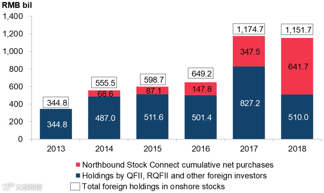Note: The amount of holdings by QFIIs, RQFIIs and others is estimated as the difference between the total foreign holdings in onshore stocks and the cumulative net purchases via Northbound Stock Connect.