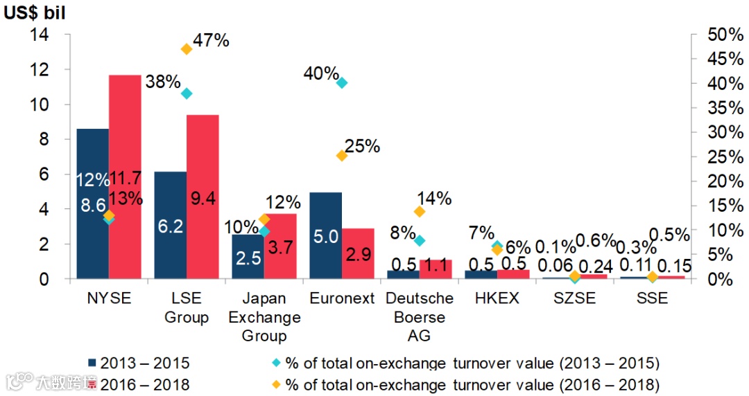 Average daily turnover value of negotiated trades of major stock exchanges (2013 – 2015 and 2016 – 2018)