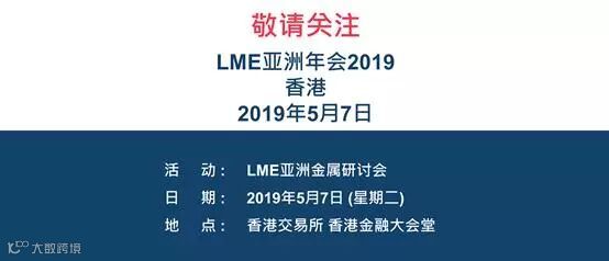 作为第七届LME亚洲年会的重头戏,LME亚洲金属研讨会将在2019年5月7日(星期二) 于香港交易所香港金融大会堂隆重举行, 并在同日晚上于香港会议展览中心举行晚宴,聚集来自世界各地的金属及金融市场业界精英。