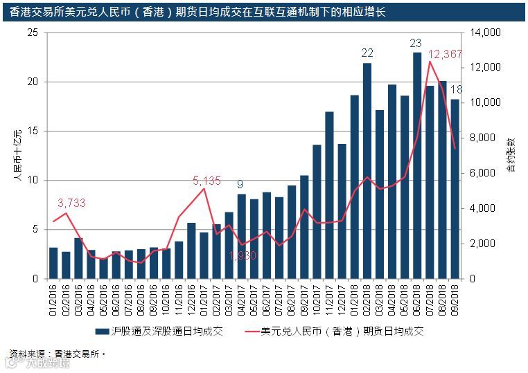 透过证券市场互联互通机制(包括2014年11月推出的沪港通与2016年12月推出的深港通)和2017年7月推出的债券通等多渠道下的北向交易,环球投资者可在香港投资内地市场的合资格人民币证券,进一步拓宽了国际投资者可在离岸市场买卖的人民币产品种类。统计数据显示,环球投资者对通过上述市场互联互通机制在离岸进行人民币产品交易的兴趣日益增加,与此同时,香港的人民币衍生产品交易活动也因应相关风险管理需求而同见增长,香港的人民币产品生态系统逐渐成形并蓬勃发展。