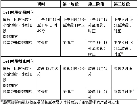 当取得监管机构批准及待市场准备就绪后,指数期货的交易时间暂定于2017年11月6日起延长至凌晨1时(第一阶段)。根据市场评估,143名已登记参与T+1时段交易的交易所参与者中,78%(111名)现正(i)参与买卖香港交易所的货币或商品产品(交易时间于凌晨1时结束),及/或(ii)提供海外衍生产品交易服务,故毋须大幅调整营运安排便能支援更长时间的T+1时段。