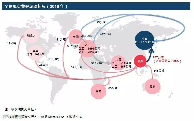 市场需要进行大量实体交易,是形成价格基准的重要先天因素之一。如下图所示,中国进口黄金占全球供应约四分之一,当中约70%均经香港进入中国。交易量如此巨大,开发相关衍生产品市场满足风险管理的基本需求很大,纽约和伦敦的金市过去正是基于此而发展起来的。