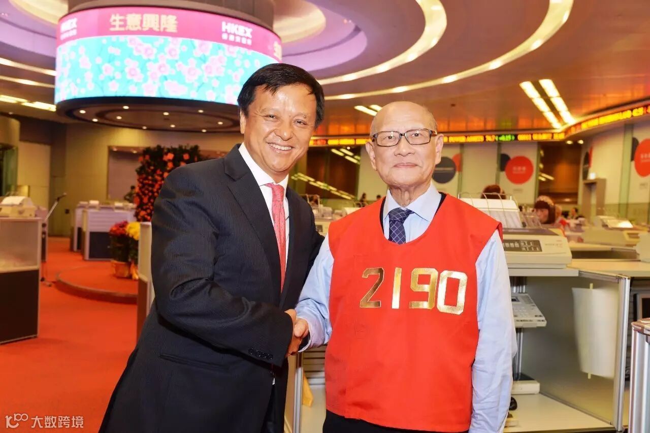 李小加与出市代表龙炳唐亲切合影。龙先生年逾92岁,自香港联合交易所1986年4月2日开始在交易广场运营以来一直在交易大堂工作至今,资历深厚。