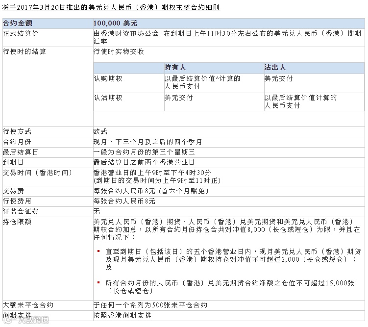 有关提供美元兑人民币(香港)期权交易的期交所参与者名单将载于香港交易所网站内之“人民币货币产品”专页。请点击阅读原文了解更多。
