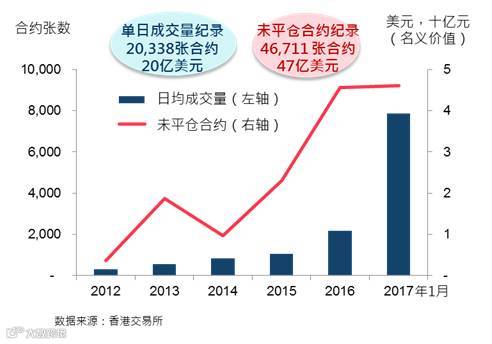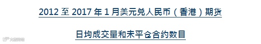 今年一月,美元兑人民币(香港)期货的成交量同比上升57%,未平仓合约及单日成交量也创出新高(未平仓合约:1月4日46,711张合约(名义金额47亿美元或人民币320亿元),单日成交量:1月5日20,338张合约(名义金额20亿美元或人民币140亿元))。自2017年2月14日起,美元兑人民币(香港)期货新增一个季度合约月份及16个跨期组合可供买卖。