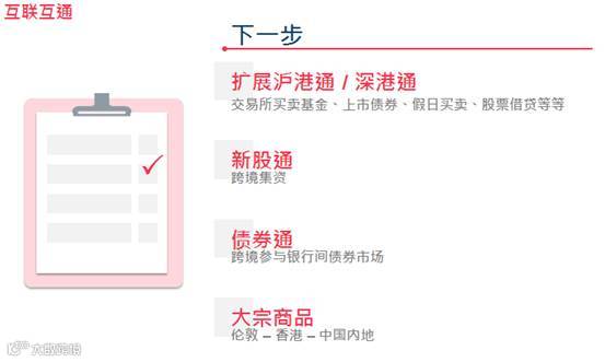 很多人都在问,深港通推出之后,互联互通计划的下一步是什么?有没有相关范畴及时间表?这是香港交易所延伸互联互通的一份工作清单。