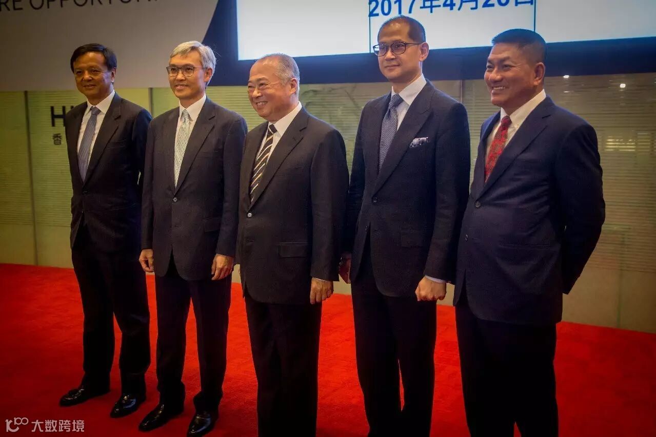 香港交易所主席周松岗(中)、集团行政总裁李小加(左一)及新任董事姚建华(左二)、梁柏瀚(右二)、谢清海(右一)会见媒体