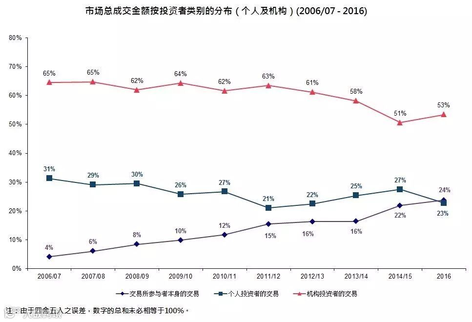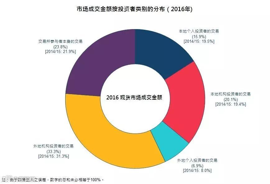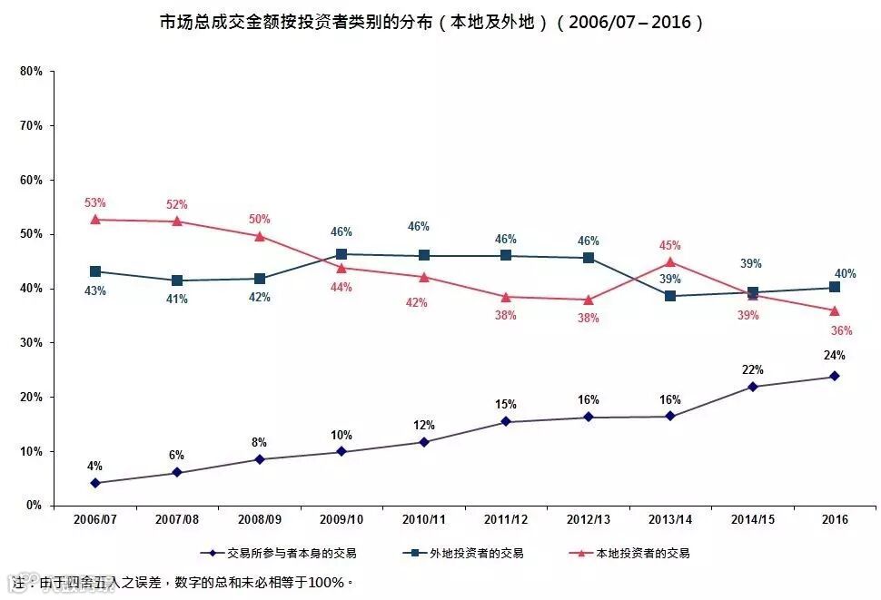 2016年度,外地机构投资者的交易占市场总成交金额的33%(2014/15年度为31%),而外地个人投资者的交易比重则为7%(2014/15年度为8%)。本地机构投资者的交易占市场总成交金额的20%(2014/15年度为19%),而本地个人投资者的交易比重则为16%(2014/15年度为19%)。