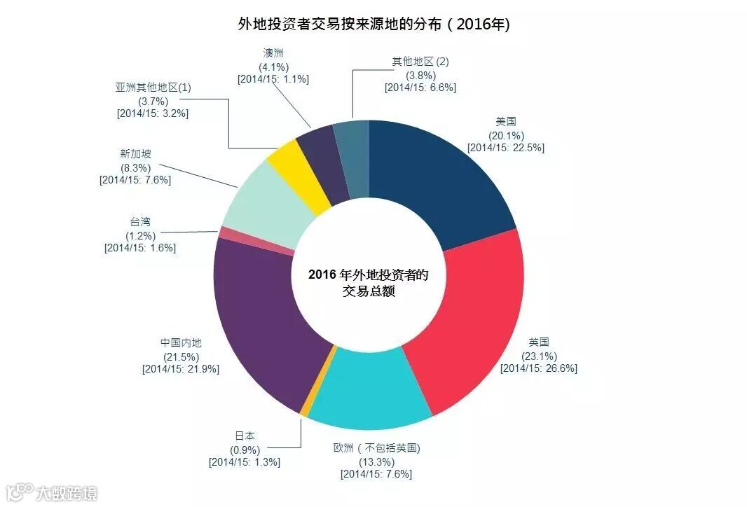 英国继续是外地投资者交易的最主要来源地 — 占外地投资者交易的23%及市场总成交金额的9%(2014/15年度分别为27%及10%)。中国内地则取代美国,成为第二大来源 — 占外地投资者交易的22%及市场总成交金额的9%(与2014/15年度的水平相若)。美国投资者的交易则由第二位下滑至第三位 — 占外地投资者交易的20%及市场总成交金额的8%(2014/15年度分别为22%及9%)。欧洲大陆投资者交易的比重于2016年度增至外地投资者交易的13%(2014/15年度为8%)及市场总成交金额的5%(2014/15年度为3%)。