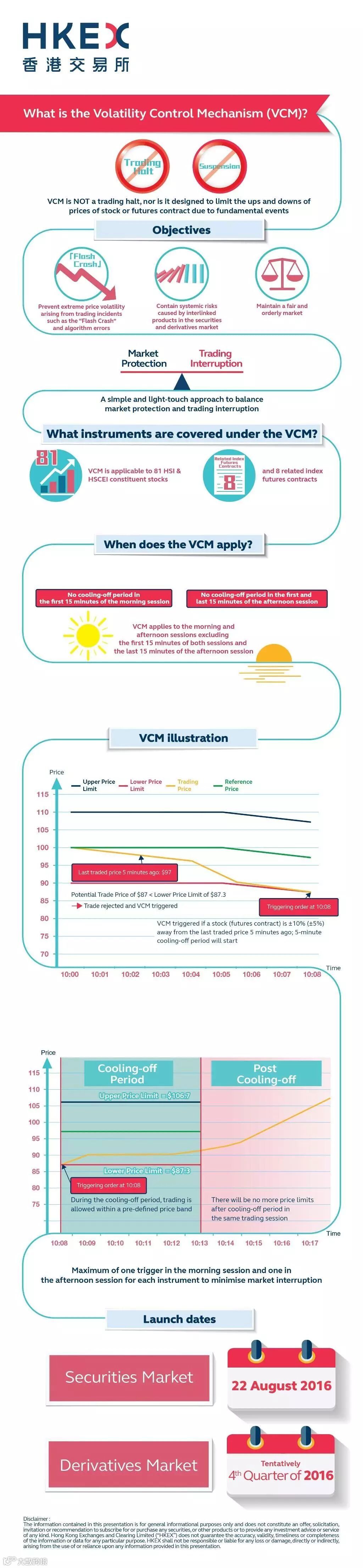 HKEX is preparing to introduce its Volatility Control Mechanism (VCM), which will cool the market for five minutes when there are abrupt price changes on individual stocks or futures. It's tentatively set to begin on 22 August 2016. One unique aspect of HKEX’s VCM is that trading will continue even when the VCM is triggered.