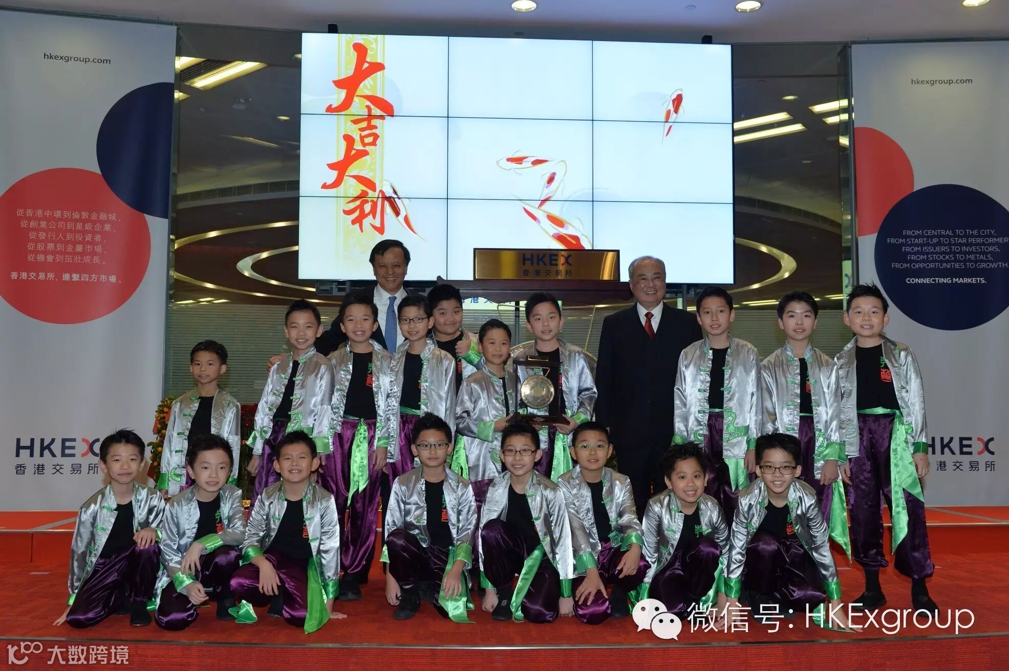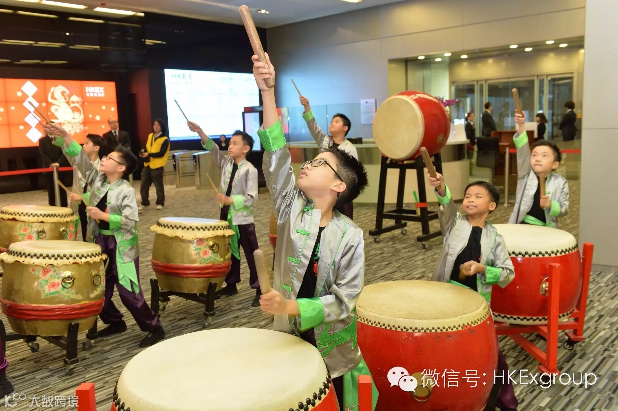 After hitting the gong to open the market, students from Ying Wa Primary School in Hong Kong gave a spectacular drum performance to ring in the Year of the Monkey.