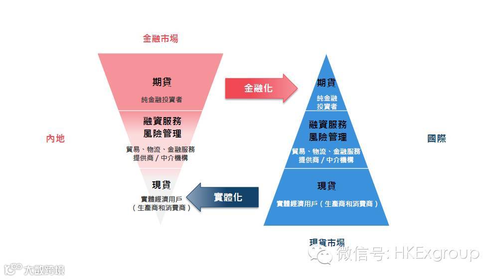 也许有朋友会问,香港发展商品业务为什么一定要去内地建现货平台而不是直接在香港做期货?香港一向缺乏商品交易的土壤,即使在收购了LME之后,香港交易所在亚洲时段也不具备上述三个层面中的任何一层。要构建一个稳固结实的商品金字塔,香港首先要做的是打地基——建现货交易平台,这有点类似当年香港先发展H股上市现货平台再开发股指期货。但香港面积有限,并不具备建设商品现货交易平台包括仓储物流系统的条件。与发展股票业务不同的是,大宗商品不会像H股上市公司一样自己可以主动“跑”来香港上市。我们必须去内地开创一个大宗商品的“IPO平台”。因此,有现货平台需求的内地成为香港交易所发展第一层与第二层市场的必然选择。