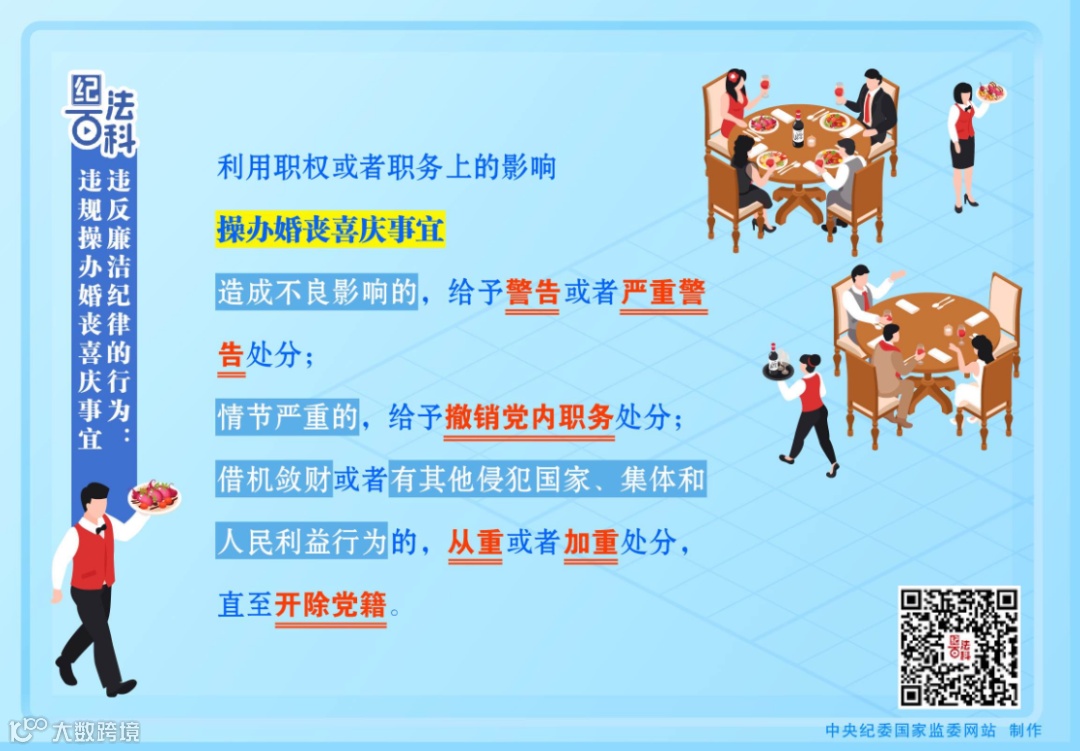 《中国共产党纪律处分条例》第一百条规定,利用职权或者职务上的影响操办婚丧喜庆事宜,造成不良影响的,给予警告或者严重警告处分;情节严重的,给予撤销党内职务处分;借机敛财或者有其他侵犯国家、集体和人民利益行为的,从重或者加重处分,直至开除党籍。