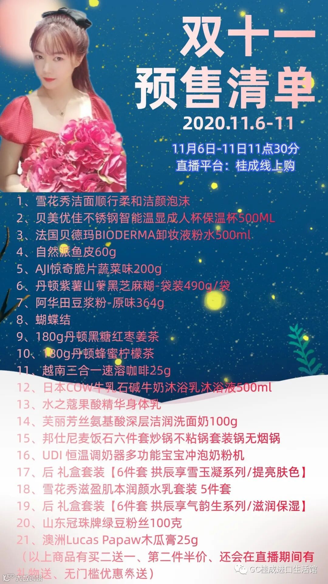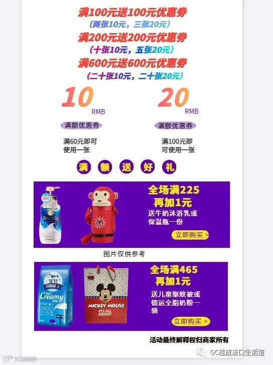在11月6号到11月11号活动期间在桂成进口生活馆消费满以下条件,凭消费换取;一次性消费满以下条件,就获得以下优惠劵,再者消费满额后可加一块钱送以下好礼。