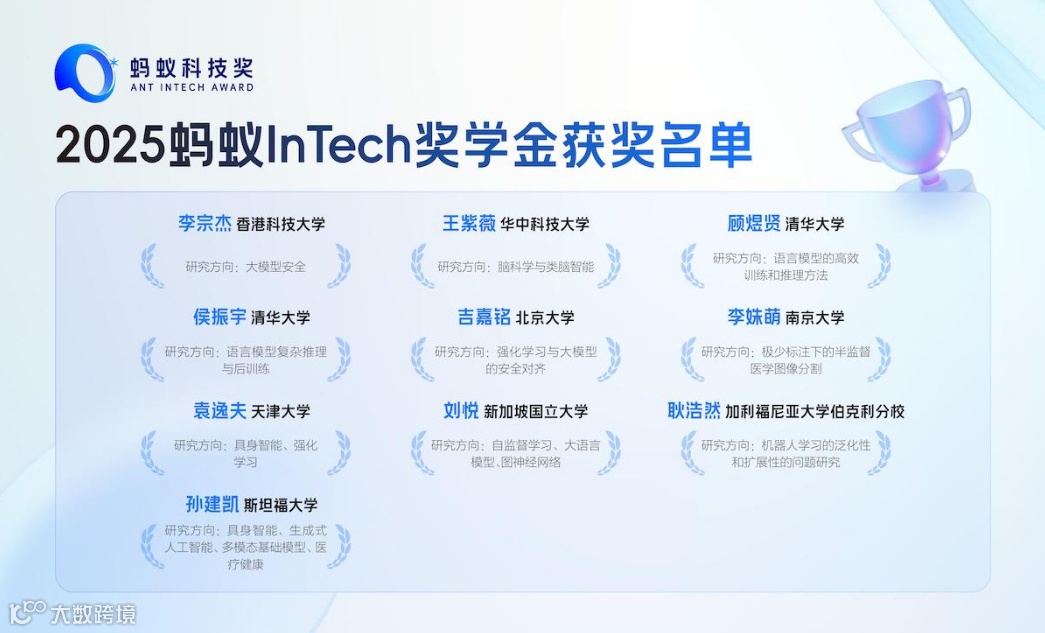 大会同期颁发了“2025蚂蚁InTech奖学金”获奖名单,来自加州大学伯克利分校、斯坦福大学、北京大学、清华大学、香港科技大学等高校的10位中国籍在读博士生,每人获5万元奖金。