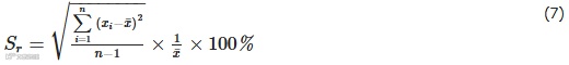 选取中间反射比值的标准灰阶卡,将标准灰阶卡放置在检测模块上,直接使用分析仪测定此时的测量值xi,重复测定6次,记录仪器示值,并计算平均值,按公式(7)计算相对实验标准偏差,作为分析仪的重复性结果。
