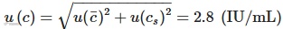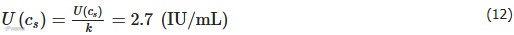 实际校准时在重复性条件下连续测量3次,以3次测量的算术平均值作为结果,则由测量重复性引入的标准不确定度分量:u(c¯)=s(ci)/3–√=0.6 (IU/mL)。