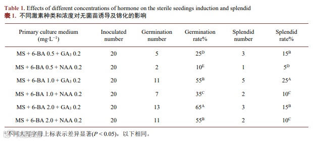 新长成的无菌芽有的保持锦化状态,有的则为全绿色,在不同激素浓度的培养基中,萌发数及锦化率差异显著(表1)。综合萌芽率及锦化率,‘蜘蛛网’八角金盘筛选MS + 6-BA 1.0 mg∙L−1 + GA3 0.2 mg∙L−1做为适宜的初代培养基,萌发率可达到55%,锦化率可达到25% (图1(B))。
