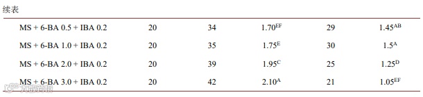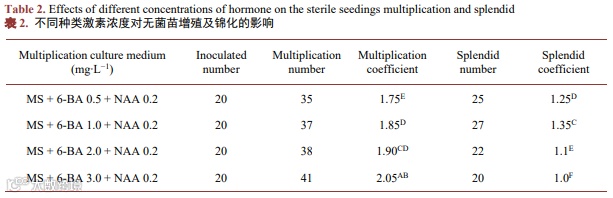 增殖系数 = 增殖数/接种数;锦化系数 = 锦化数/接种数;移栽成活率 = 移栽成活数/移栽数 × 100%;