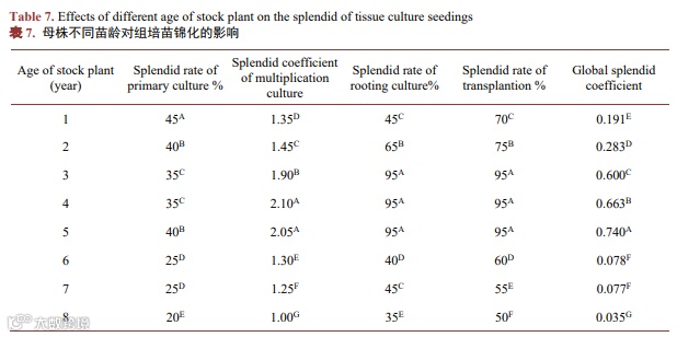 从不同苗龄的母株上取样做外植体,按以上流程及筛选的最佳培养基及培养条件,发现母株苗龄对后期锦化影响很明显(表7)。鉴于此,‘蜘蛛网’八角金盘组培繁殖时,应选择苗龄为3~5年生的母株,锦化稳定性较强。