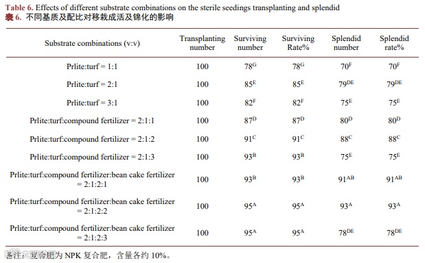 移栽过程中也会有少量种苗退锦,不同基质配比中,移栽成活率及锦化率略有不同(表6)。