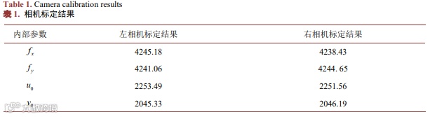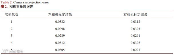 对相机采集图像采用张正友标定法得到左右两个单目相机的内部参数、外部参数,左右相机标定结果如表1所示。如表2所示,重投影误差仅为0.0332像素,可满足测量精度要求。