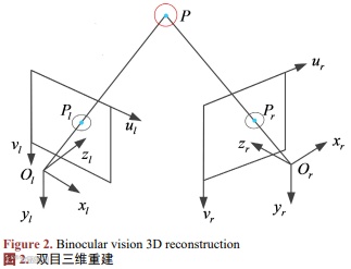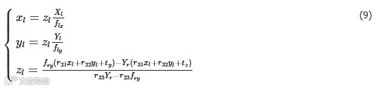 以左相机坐标系为相机参考坐标系,点P 在左相机坐标系中的三维坐标可通过下式计算得出: