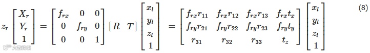 式中,R和T为左相机坐标系与右相机坐标系之间的旋转矩阵和平移向量。