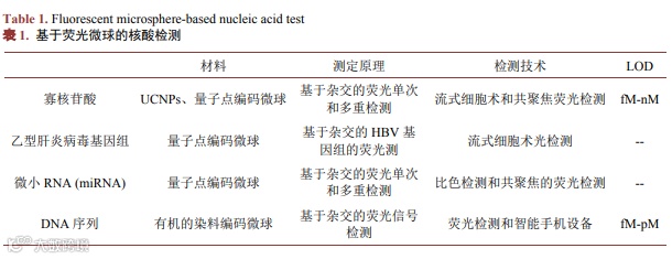 在核酸检测方面,与目标脱氧核糖核酸和核糖核酸互补的序列被用作荧光微球上的探针(表1)。